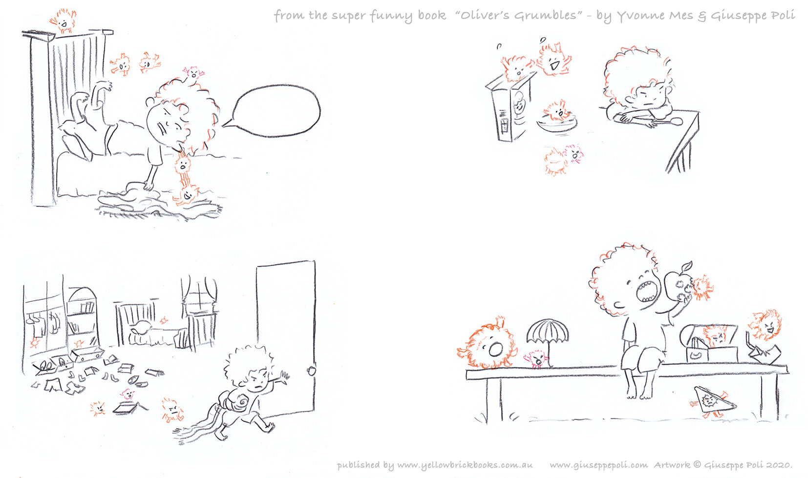 Oliver is a happy little boy, until one day he wakes up with Grumbles in his head…. and Grumbles IN HIS BED!!